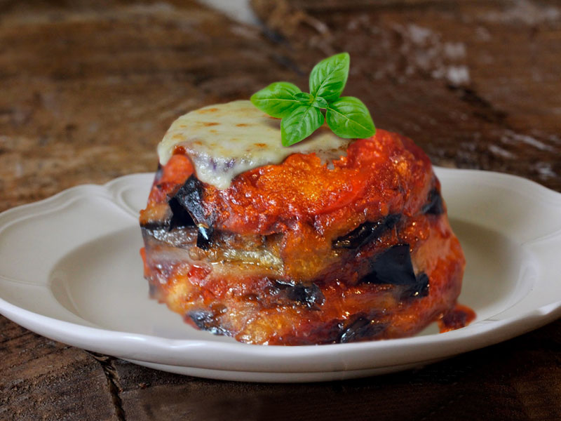 Cubrir nuevamente con otra capa de rodajas de berenjena y sobre ella otra capa de tomate frito